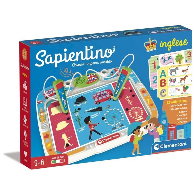 Imparare l'inglese è semplice con il gioco delle associazioni! Sapientino è un gioco classico che non smette mai di coinvolgere i bambini e di farli imparare divertendoli. Contiene 16 schede educative con 32 attività e tanti quiz che il bambino potrà risolvere associando i diversi elementi con gli spinotti. La tecnologia elettronica delle penne è altamente sensibile e avvisa il bambino se le associazioni sono giuste permettendogli di imparare in autonomia. Il programma educativo delle schede è strutturato a difficoltà crescente e presenta tante parole inglesi in modo semplice e intuitivo.