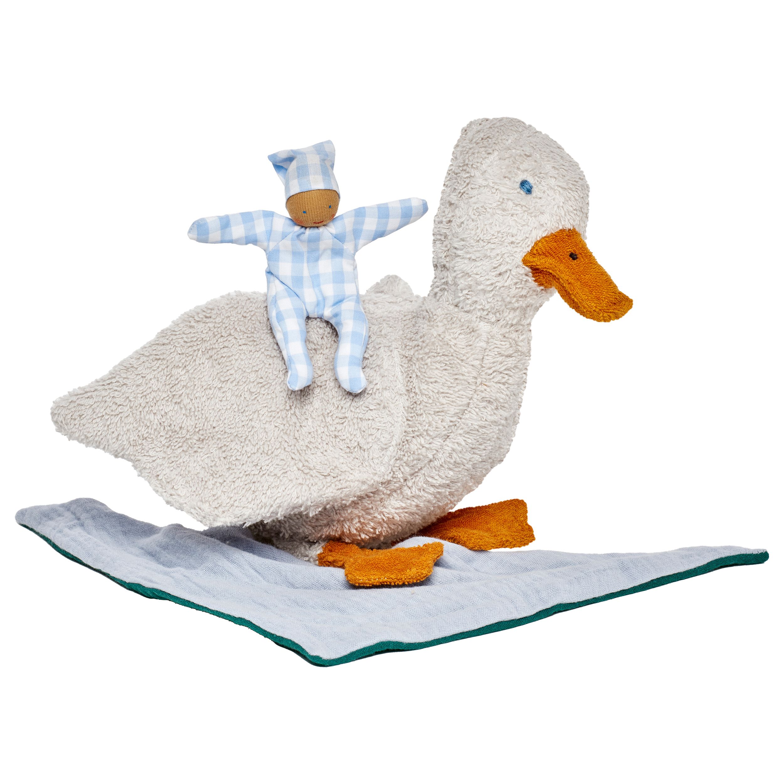 L'anatra Enzo tende la mano a ogni bambino - e poi non si allontana più. Il piccolo amico coccoloso è realizzato in morbido Baumwollfrottee e viene fornito con un fazzoletto triangolare in mussola bicolore e un pupazzetto protettore per la stanza dei bambini. Il piccolo pupazzetto si tiene alle ali dell'anatra mentre il bambino può seppellire le mani sotto di esse: così accogliente può essere la sicurezza. Enzo fa parte della famiglia di anatre Käthe Kruse ed è un vero animale preferito.