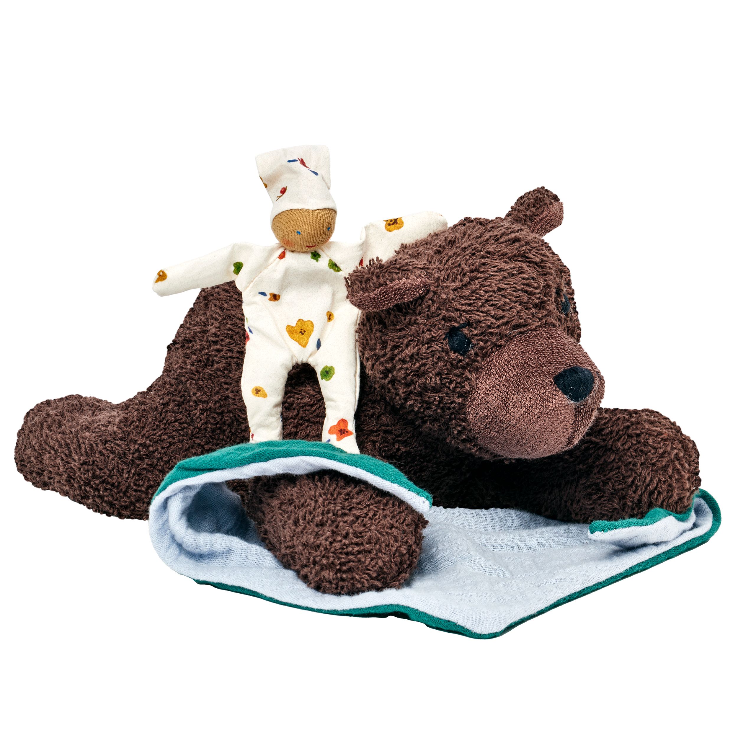 Benji Orso ama sdraiarsi a pancia in giù e farsi accarezzare le morbide zampe. L'amico goffo è progettato in modo che appaia molto vivace e attento. Le sue gambe pendono di lato, in modo da abbracciare il bambino. Il piccolo pupazzetto si gode il tempo sulla schiena di Benji, prima di partire per la prossima avventura. Come parte della famiglia di orsi Käthe Kruse, Benji è un amico particolarmente socievole in frottee di cotone, che porta con sé un fazzoletto triangolare in mussola bicolore.
