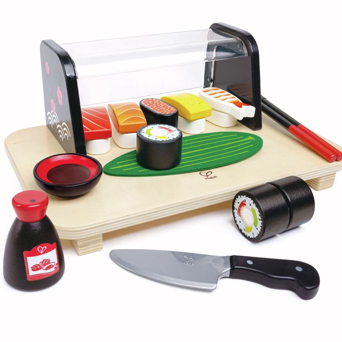 - Il set include un tagliere, una vetrina refrigerata, una ciotola con pasta di wasabi da gioco, una bottiglietta di salsa di soia da gioco, un paio di bastoncini per mangiare, un coltello da gioco, sei rotoli di sushi e un rotolo di alga