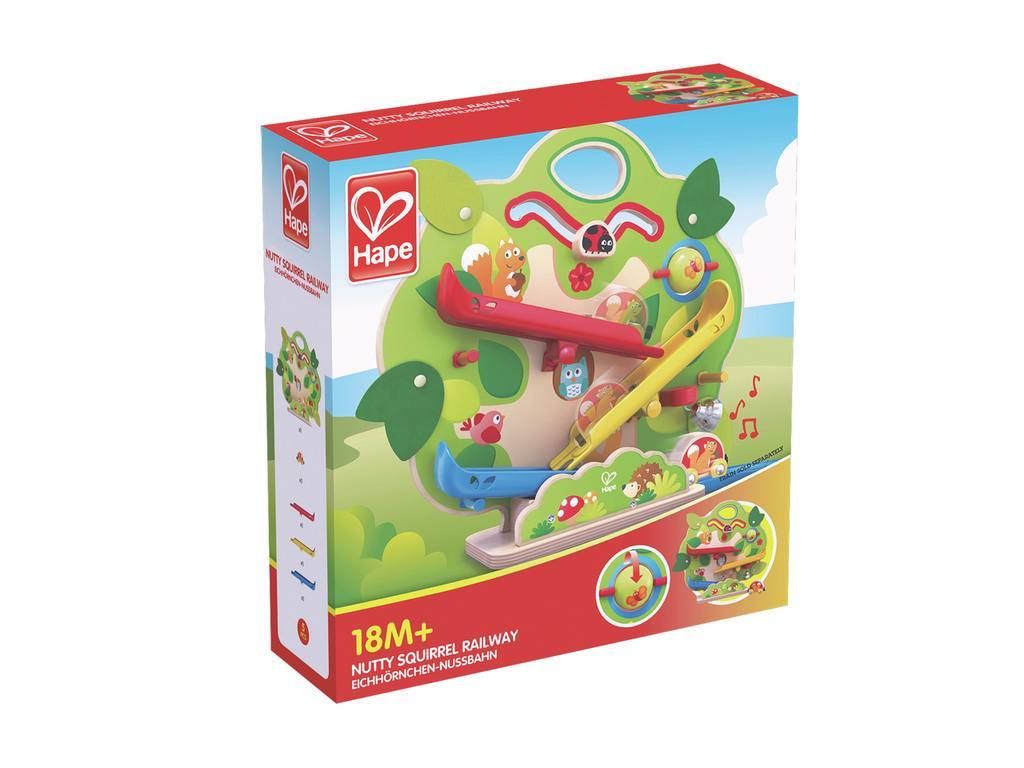 Costruisci la pista di legno come descritto sulla confezione. Posiziona il carrello dello scoiattolo sui binari in cima all'albero e lascialo andare. Lo scoiattolo scivolerà giù dalla rampa nel suo carrello e farà suonare la campana quando arriverà in fondo. Fai volare l'uccello ruotando il globo e spingendo la felice coccinella affinché si muova.