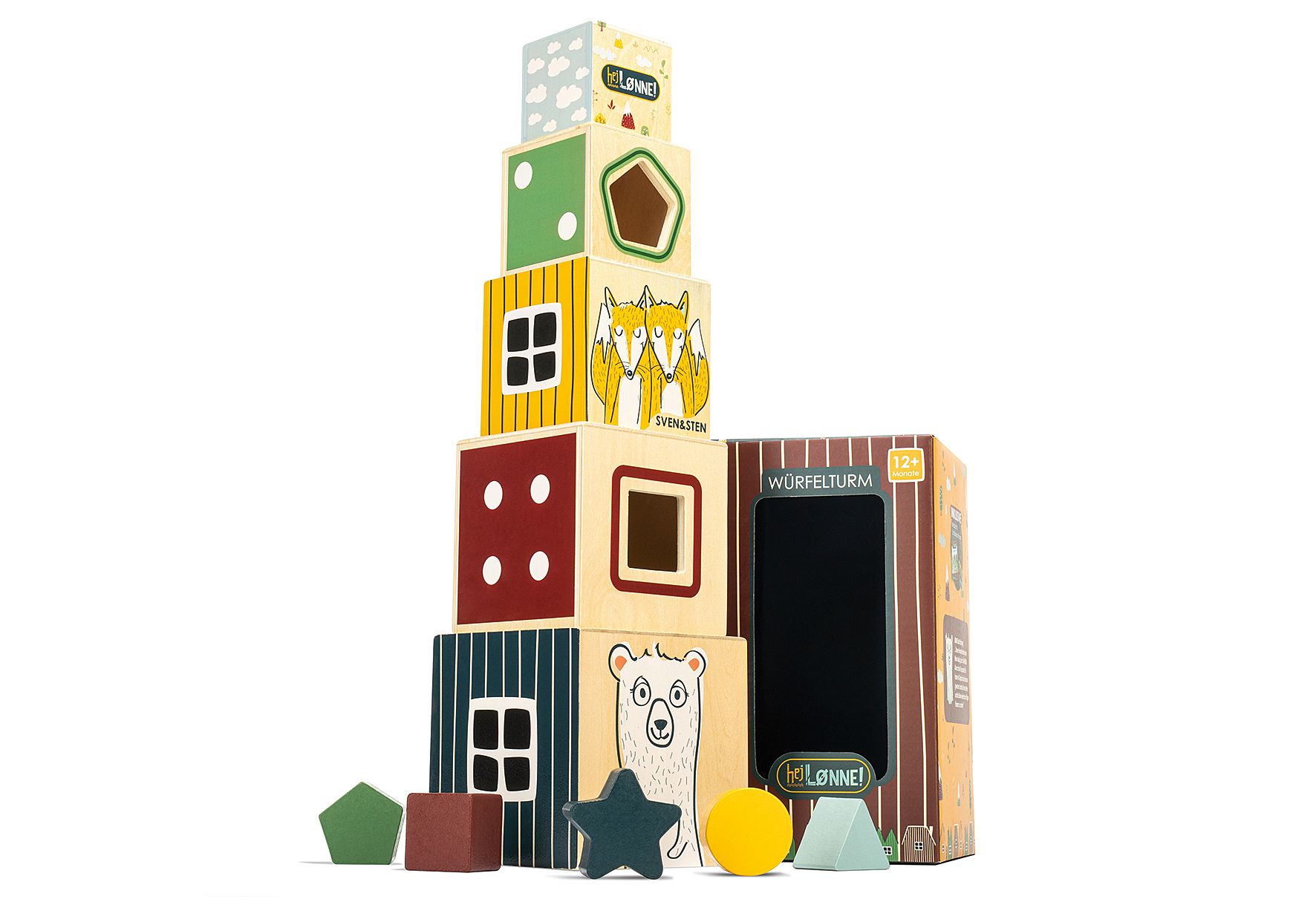 Komplett zum Liebhaben – Kinder Spielzeug mit Story, für Kinder ab 1 Jahr, 5 Stapelwürfel Holz und 5 Holzsteine zum Durchstecken, Holzspielzeug inkl. Minibuch, Baumwollbeutel und Schlüsselanhänger. Durchdacht– Stapelturm Baby Spielzeug zum Stapeln und Ineinanderstecken, Seitenlänge von 6 bis 12 cm, Stapelhöhe 45 cm, 5 liebevoll gestaltete Motiv-Seiten, 1 Seite mit Form-Ausstanzung, passend für Steinchen. Spielend lernen- Spiel und Spaß mit Figuren aus der „hej LØNNE!“-Serie. Ganzheitliches Konzept, skandinavisch designt, großer Lerneffekt, fördert Feinmotorik, Verständnis für Zahlen, räumliches Denken und Haptik. Für unsere Kleinsten - Genderneutrales Kinderspielzeug aus hochwertigem, schadstofffreiem Holz, kindgerechte Formen und ausgewählte, wasserbasierte Farben, daher absolut unbedenklich. Zauberhafte Geschenkidee - Sinnvoll und entwicklungsfördernd, in allerliebster, stabiler Verpackung, großartiges Geschenk für Kinder von Eltern und Familienangehörigen, Paten und Freunden, perfekt auch für die Kita.Technische Details: Name Wert Marke HEJ LØNNE Materialmix Holz Länge 12 cm Breite 12 cm Höhe 45 cm Gewicht 570 g Lieferumfang 5 Stapelwürfel Holz und 5 Holzsteine zum Durchstecken, inkl. Minibuch, Baumwollbeutel und Schlüsselanhänger