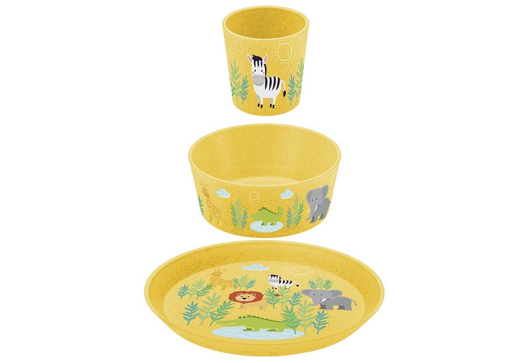 Das Geschirrset mit dem niedlichen Tiermotiv begeistert auf den ersten Blick. Der kleine Teller ist ideal für Obst und gesunde Snacks und die kleine Schale macht sich für Müsli oder kleine Gerichte schnell unentbehrlich. Der kompakte Becher lässt sich von kleinen Händen gut greifen und kommt gänzlich ohne Henkel aus. CONNECT AFRIKA ist robsut, leicht und stapelbar und verzeiht auch mehrfache Saltos vom Esstisch. Ein wahres Multitalent für jeden Tag.Technische Details: Name Wert Marke KOZIOL Farbe organic yellow Materialmix Thermoplastischer Kunststoff Länge 205 mm Breite 205 mm Höhe 80 mm Lieferumfang 3-teilig, Teller, Becher, Schale Eigenschaften spülmaschinengeeignet | melaminfrei | mikrowellengeeignet Spuelmaschinengeeignet ja