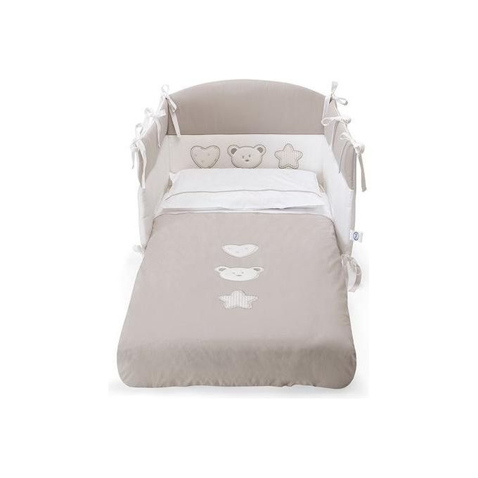 - CaratteristicheRivestimento in 100% cotone con interno in ?bra di poliestere arricchito da tessuto stampato personalizzato ed applicazioni in tessuto ricamato. Il set comprende: paracolpi sagomato, piumone s?labile (cm 75x125) con copripiumone e federa cuscino (cm 60x40)