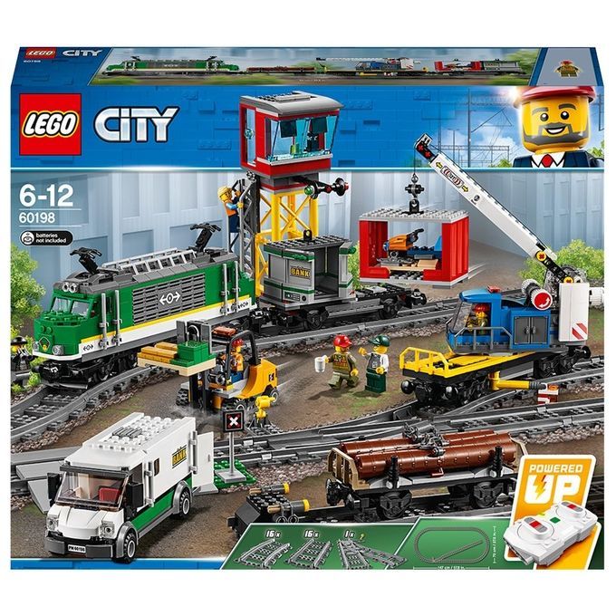 Carica il potente Treno merci LEGO City 60198 e consegna le merci in tempo! Questo fantastico set LEGO City contiene un locomotore con telecomando Bluetooth a 10 velocità, cabina di guida accessibile, carro gru con braccio girevole ed estensibile, vagone container con 2 container e carro legname, più un furgone blindato con sportelli apribili e un carrello elevatore con roll bar apribile e forche di sollevamento. Questo bellissimo set LEGO comprende anche una ferrovia circolare con 16 rotaie curve, 16 binari dritti e uno scambio ferroviario con leva, più un centro di controllo con scala e 2 pallet costruibili con banconote, lingotti d’oro, uno scooter da neve e 6 minifigure LEGO.