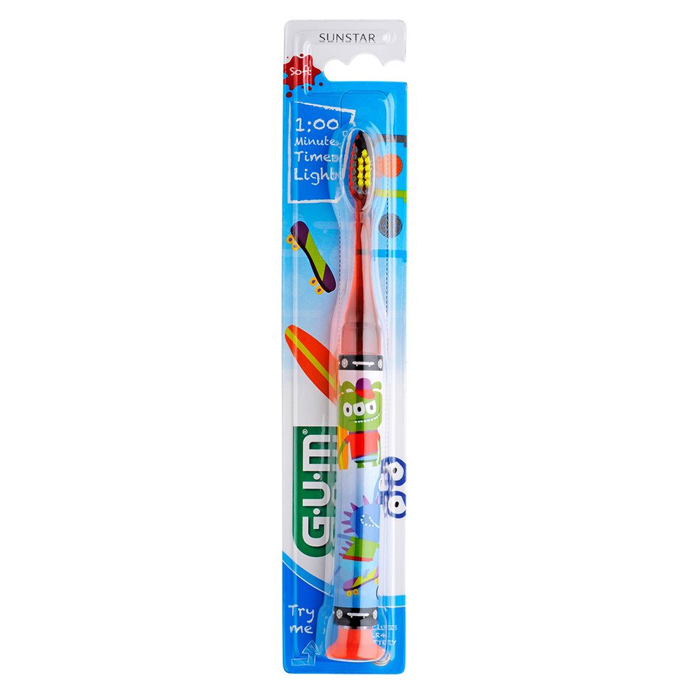 Spazzolino GUM Light Up per bambini 7-9 anni; personaggi divertenti che si illuminano per 1 minuto per incentivare lo spazzolamento; setole morbide; ventosa per mantenere lo spazzolino in posizione e le setole pulite; cappuccio salvaigiene; marchio GUM (SUNSTAR), codice 903M.