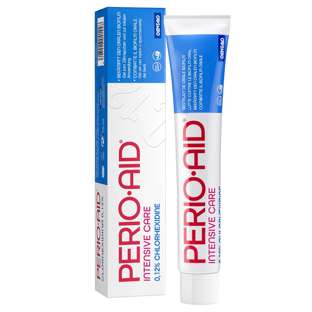 PERIO AID 0,12% INTENSIVE CARE GEL 75 ML PERIO AIDPERIO AID Intensive Care Gel Descrizione Gel per uso topico o spazzolamento dei denti. Combatte il biofilm orale. Indicato dopo le cure odontoiatriche, in persone con eccessiva formazione di placca dentale (biofilm orale), per uso topico nel cavo orale, contemporaneamente all'uso di un collutorio a base di Clorexidina. Perio Aid Intensive Care Gel non contiene agenti anionici che potrebbero interferire con l'attività della clorexidina. Composizione Clorexidina digluconato 0,12%. Modalità d'uso Spazzolare accuratamente i denti almeno 2 volte al giorno, con particolare attenzione alle zone affettate. Non ingerire. Anche per uso topico nel cavo orale. Avvertenze Effetti collaterali: In certi casi può apparire una alterazione del gusto e, in molte rare occasioni, irritazione nella lingua, entrambi gli effetti diminuiscono con l'uso continuo del prodotto. - questo prodotto contiene clorexidina che, temporaneamente, può pigmentare denti e lingua. Tale evento può presentarsi occasionalmente solo dopo un uso prolungato e in presenza di alcuni alimenti e bevande cromogene, quali ad esempio vino rosso, caffè, tè e nel caso di fumatori. - queste pigmentazioni non sono permanenti e si possono evitare con una buona igiene orale, con lo spazzolamento e l'uso di prodotti per l'igiene interprossimale prima di usare il collutorio. Le pigmentazioni possono sempre essere eliminate dal professionista del cavo orale. Tenere fuori dalla portata dei bambini. Non utilizzare in caso di sensibilità ad alcuno degli ingredienti. Conservazione Non esporre a luce solare diretta. Formato Tubo da 75 ml. Cod. 32087