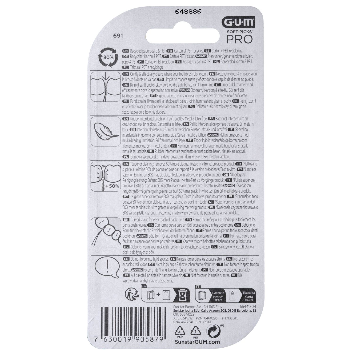 SUNSTAR ITALIANA — GUM Soft-Pick Pro Large, 30 pezzi. Scovolino interdentale in gomma con setole morbide che pulisce delicatamente dove lo spazzolino non arriva. Forma ricurva per facile accesso ai denti posteriori. Avvertenza: non forzare in spazi troppo stretti. Cod. 691M30.