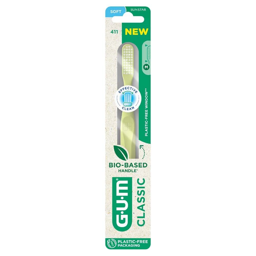 Gum Classic 411 — spazzolino manuale morbido (regular). Profilo delle setole Dome-trim brevettato, progettato per migliorare la rimozione della placca. Stimolatore con punta in gomma per il massaggio gengivale. Cappuccio salvaigiene incluso. Disponibile in vari colori. Cod. 411PQ.