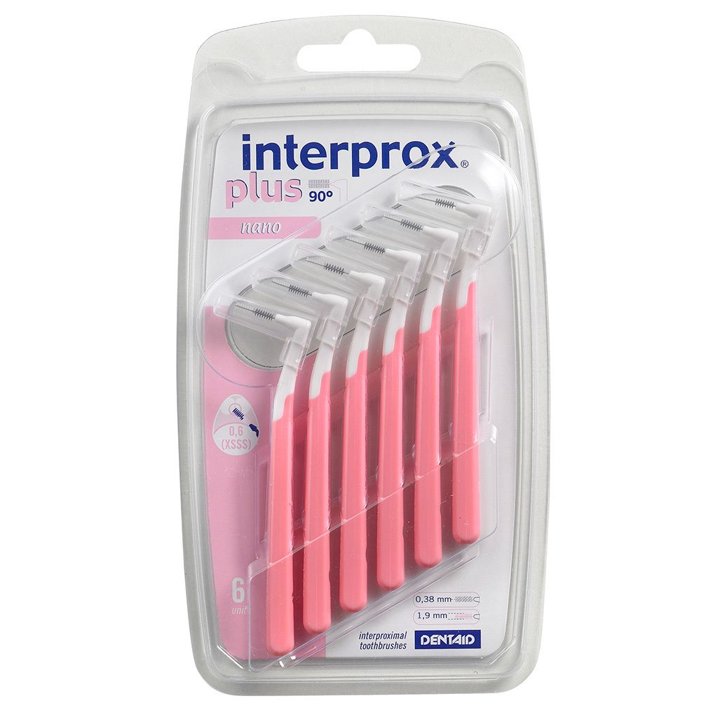 Interprox Plus Nano rosa, confezione da 6 pezzi; spazzolini interprossimali con testina angolata per accesso perpendicolare a spazi interdentali a partire da 0,6 mm; progettati per rimuovere biofilm/placca senza lesionare le gengive; manico sagomato ad angolo per premolari e molari; cappuccio protettivo incluso.