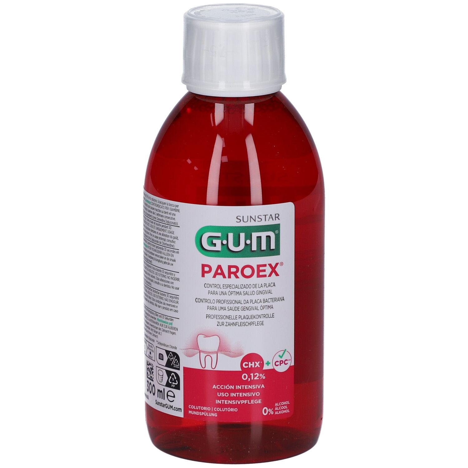 Collutorio GUM Paroex 0,12% CHX + 0,05% CPC, flacone da 300 ml; formulazione senza alcool; trattamento temporaneo per il controllo della placca e supporto del tessuto parodontale; indicato anche prima e dopo interventi orali, estrazioni e applicazione di impianti. Cod. 1784.