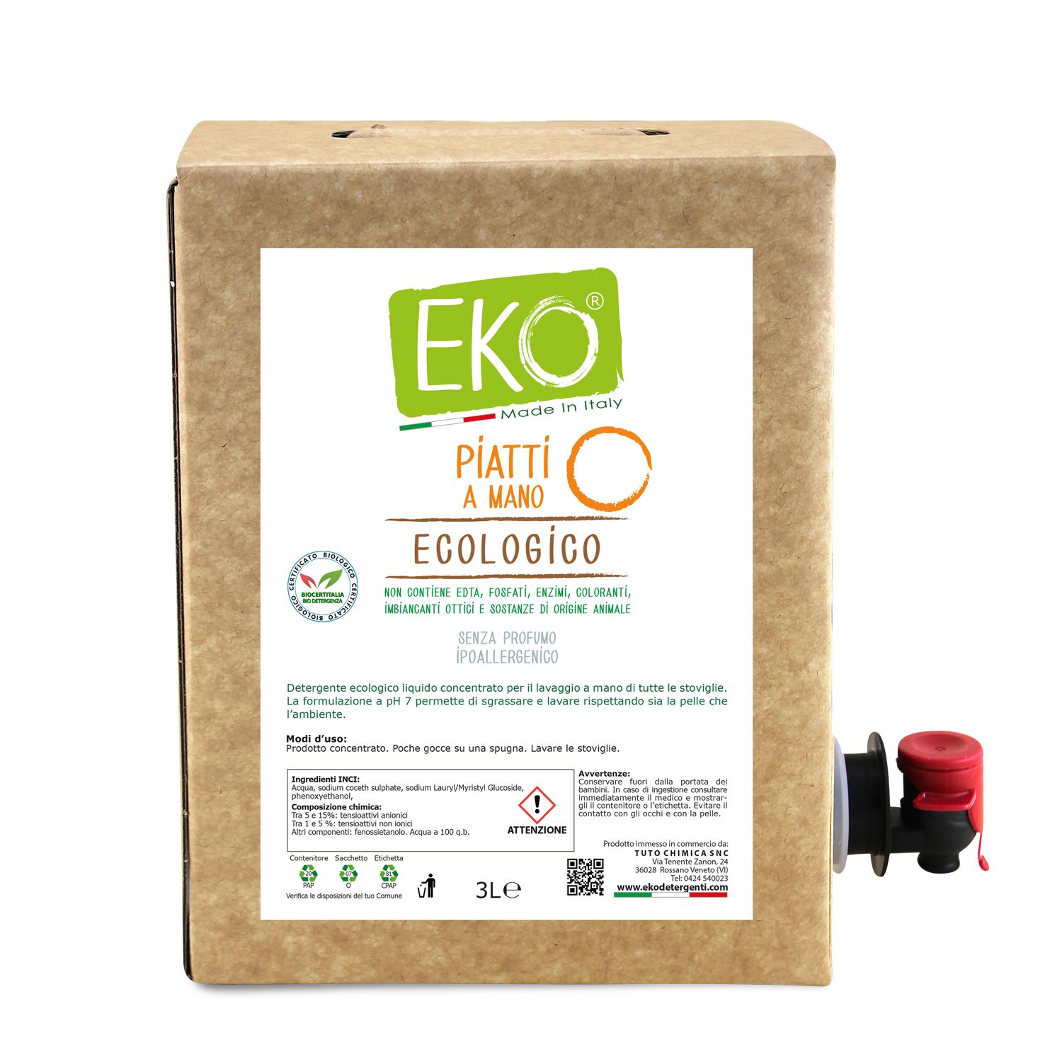 Eko Detersivo Piatti Ecologico Bag in Box lt 3 NO PROFUMO - Prodotto Professionale - CERTIFICATO BIOCERTITALIA
