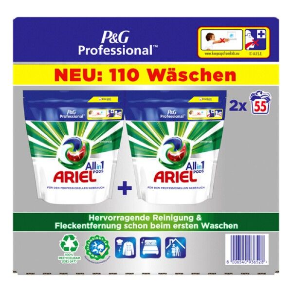Hervorragende Fleckentfernung und Reinigung schon ab dem ersten WaschgangWirkungsvolle Reinigung in einer Kapsel für eine einfache DosierungAusgezeichnete Ergebnisse selbst bei KaltwäscheFür den professionellen GebrauchAriel Professional All-In-1 PODS Flüssigwaschmittel Waschmittel in Kapseln/ Tabletten Vollwaschmittel von P&G Professional, 110 Waschladungen, Ausgezeichnete Fleckentfernung und Reinigung schon ab dem ersten Waschgang mit kontrollierter DosierungInhaltsstoffe>30% Anionische Tenside, 5-15% Seife,