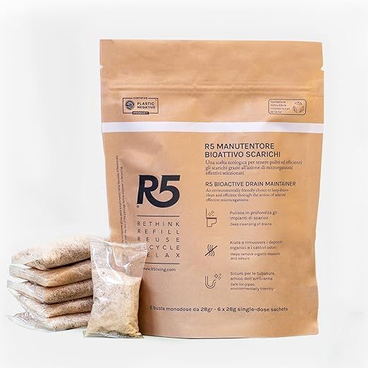 Il Manutentore Bioattivo Scarichi di R5 è la soluzione ideale per mantenere gli scarichi puliti ed efficienti in modo ecologico.