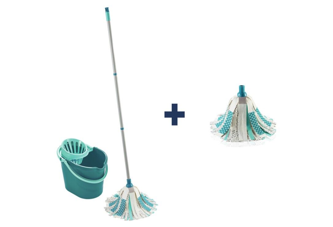 Ein komplettes Reinigungsset bestehend aus einem Eimer mit Auswringaufsatz + einem Mopp mit Teleskopstange und einem Kopf aus 3 Arten von Reinigungsquasten. Die oberen Fransen bestehen aus hochsaugfähiger Mikrofaser, die Power Scrub-Fransen zum Entfernen von hartnäckigem und eingetrocknetem Schmutz und die Power Pick-up-Fransen zum effektiven Auffangen von Staub und Haaren. Power Mop 3 in 1 reinigt effektiv Treppen und Ecken, ideal für die einfache und gründliche Reinigung von Fliesen und Steinböden, der Kopf kann in der Waschmaschine bei 60°C gewaschen werden.Spezialpaket Leifheit Set Power Mop 3in1 + gratis Ersatzkopf