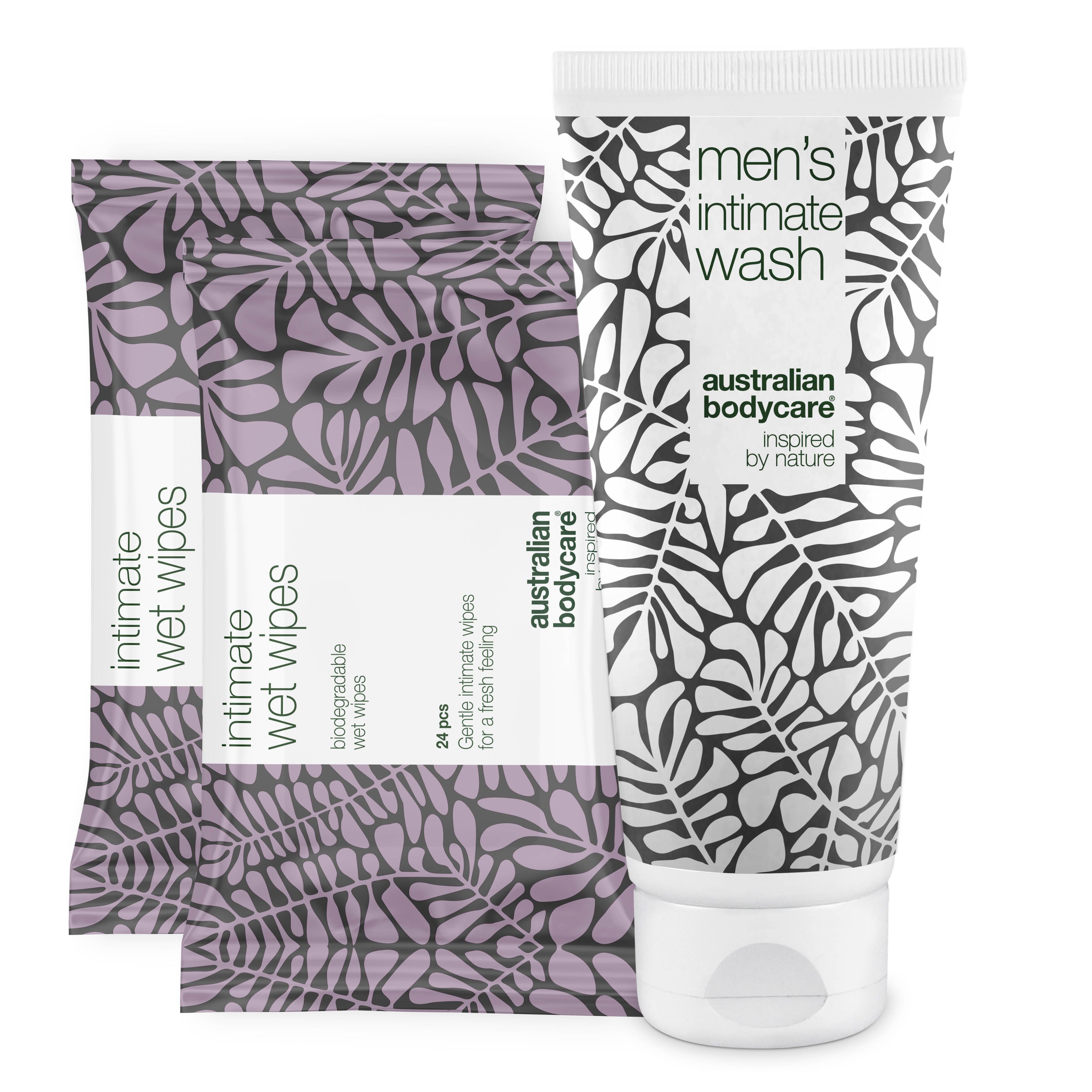 Set con biancheria intima grande e 2x24 salviette intime per la cura dello smegma. I prodotti contrastano e riducono il sebo e le cellule morte della pelle che possono trasformarsi in smegma. I prodotti intimi sono adattati al pH della zona intima e aiutano a evitare gli odori indesiderati.