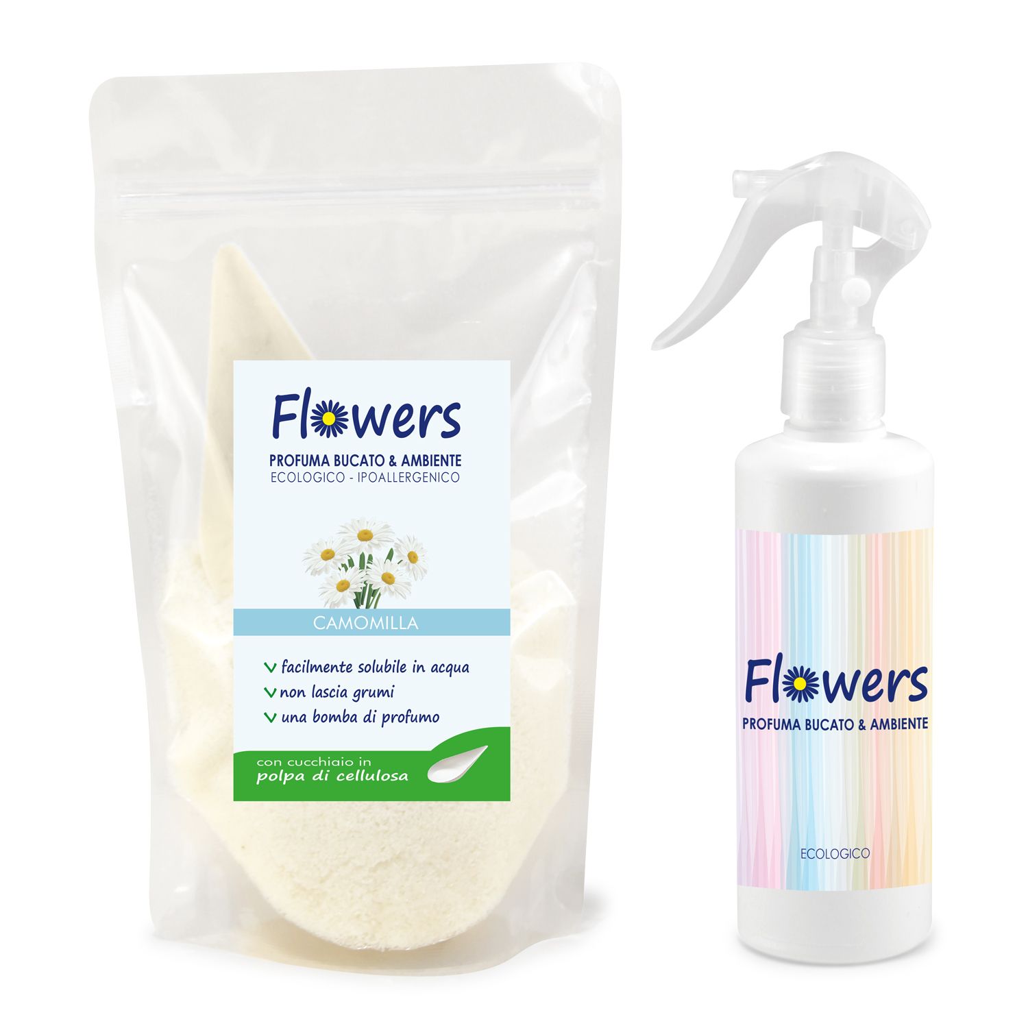 Profuma Bucato E Ambiente In Polvere Ecologico Flowers- KIT POLVERE GR 200 + SPRUZZINO - CAMOMILLA