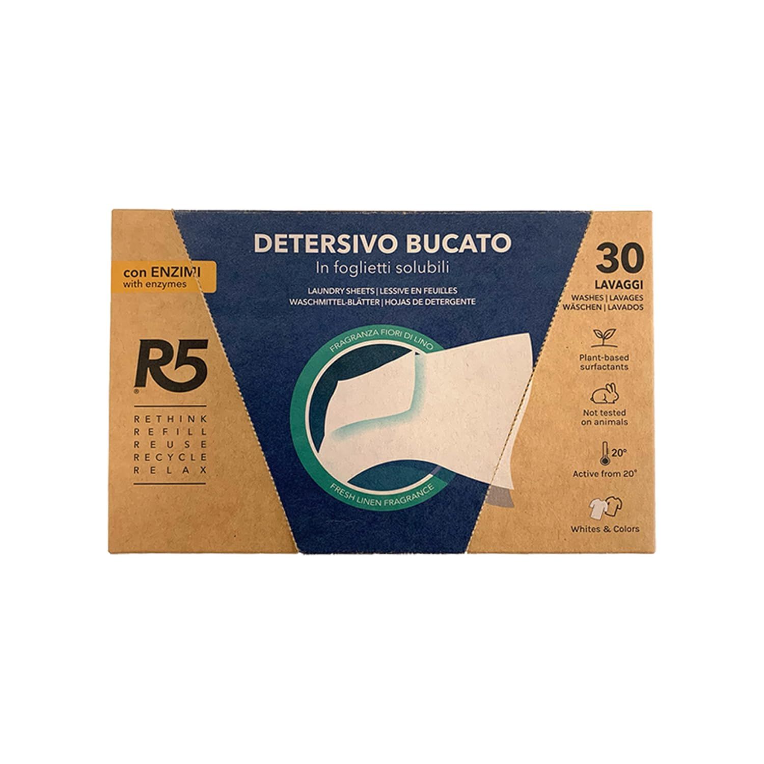 R5 Detersivo Bucato in Foglietti Solubili 30 Lavaggi, Enzimi, Profumo Fiori di Lino
