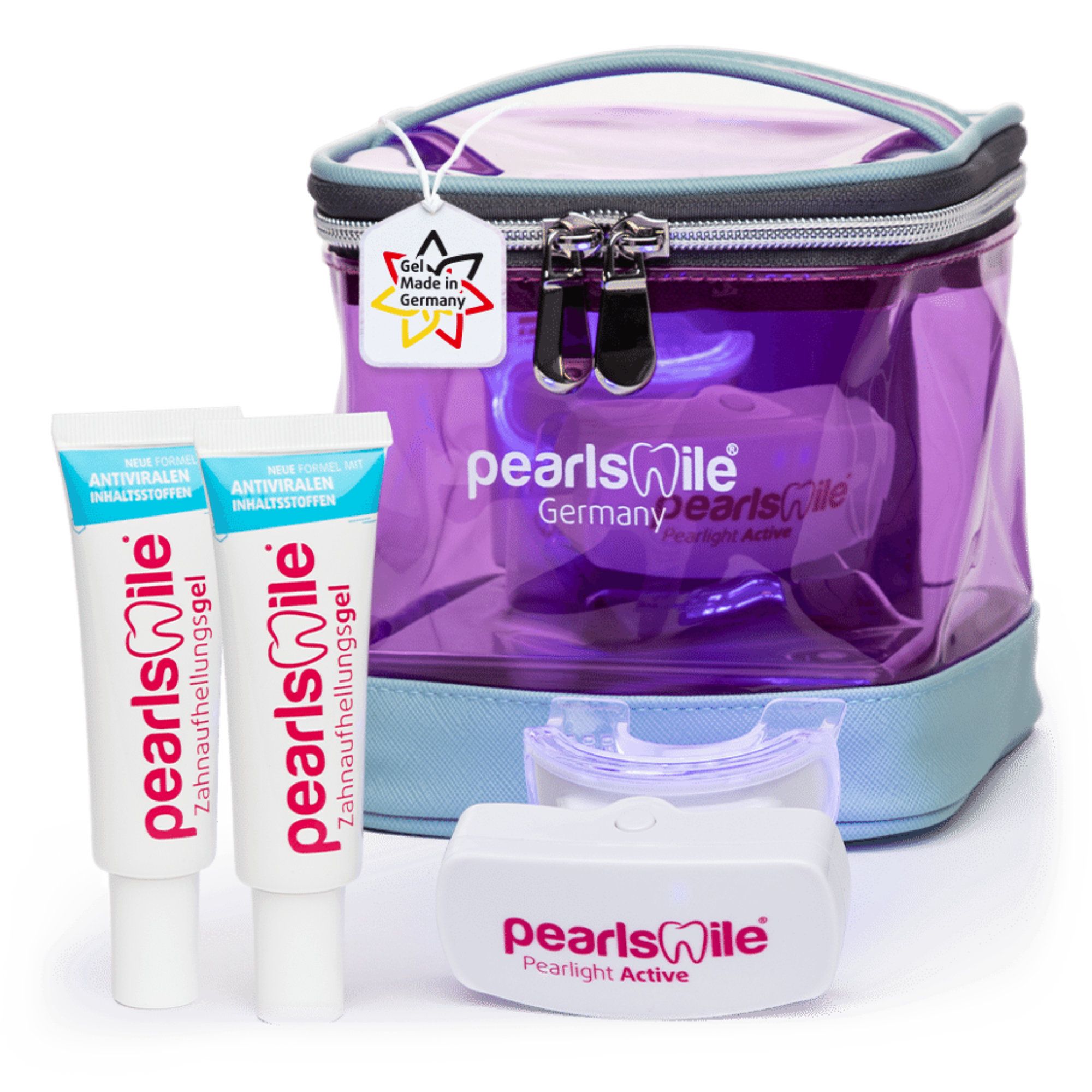 Il set include un dispositivo innovativo e riutilizzabile – la lampada LED Pearlight Active, due mascherine dentali personalizzate e due tubetti di gel sufficienti per 12 trattamenti.