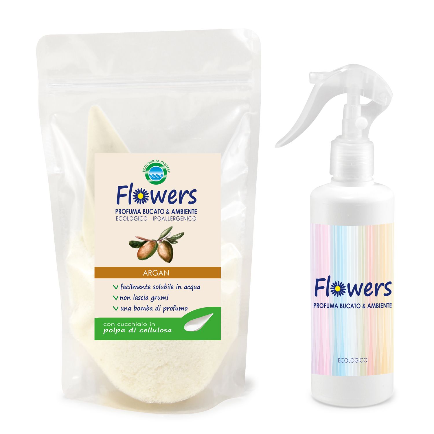 Profuma Bucato E Ambiente In Polvere Ecologico Flowers- KIT POLVERE GR 200 + SPRUZZINO - ARGAN - Prodotto Professionale