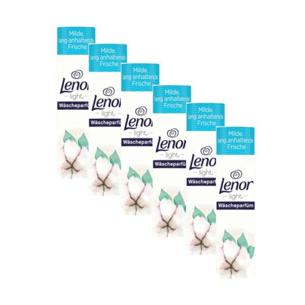 Multipack 6x300 g Lenor Light Baumwollblütte Wäscheparfüm Zu jeder Wäsche hinzufügen für milde, lang anhaltende Frische Lenor Wäscheparfüm enthält 0 Prozent Farbstoffe Dermatologisch getestet Für alle Textilien geeignet, sogar Wolle, Seide und Sportkleidung Lenor Light Wäscheparfüm ist in einer feuchtigkeitsbeständigen, vollständig recycelbaren Kartonbox erhältlich ​ Verleihen Sie Ihrer Wäsche mit dem Lenor Light Wäscheparfüm Frische Baumwollblüte milde Frische, die lange anhält. Lenor Light Wäscheparfüm enthält 0 Prozent Farbstoffe und ist dermatologisch bestätigt. Es wurde speziell dafür entwickelt, um Ihrer Wäsche einen leichten, frischen Duft zu verleihen, der lange anhält. Je nach gewünschter Duftintensität dosieren.