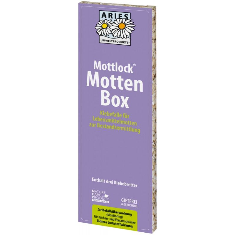 Nella nuova scatola antitarme sono incluse le collaudate trappole adesive Mottlock 3 contro le tarme degli alimenti. Rimuovere la pellicola protettiva, spingere con attenzione il pannello adesivo nella scatola antitarme, premerlo saldamente sui bordi - fatto! Ora posiziona la scatola nella dispensa e cattura le tarme maschili del cibo in modo efficace, discreto e sostenibile. Ecco come utilizzare le trappole adesive naturali contro le tarme del cibo. Togliete le trappole adesive dal coperchio e rimuovete la grande pellicola protettiva da un pannello collante. Rimuovere la piccola striscia adesiva rossa sul retro e spingere con attenzione la trappola nella scatola di cattura. Grazie ai fori nella scatola di bloccaggio, il pannello adesivo può essere premuto sui bordi non incollati. Vedi anche le istruzioni nel foglietto illustrativo.