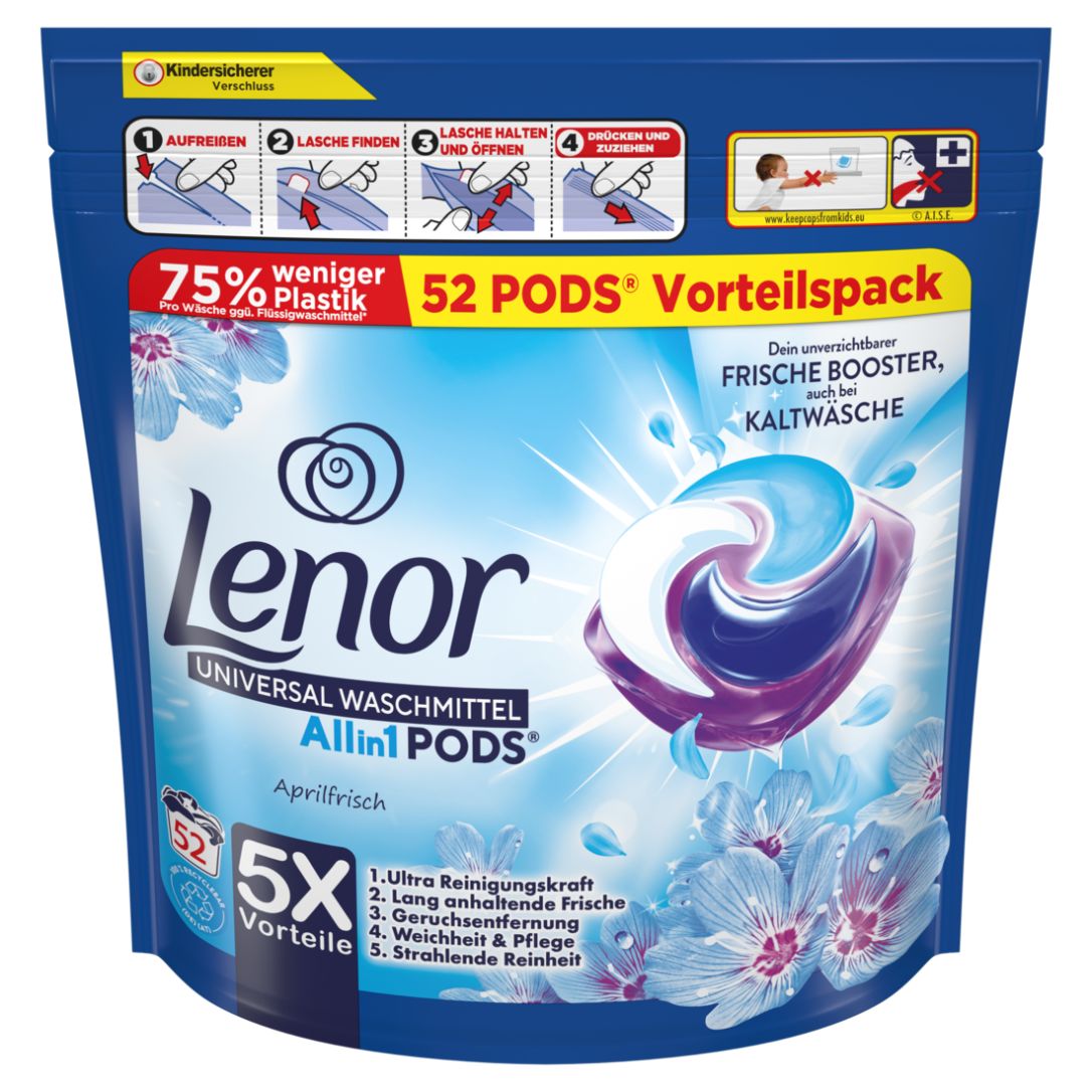 TIEFENREINHEIT & LANG ANHALTENDE FRISCHE dank der Ultra Reinigungskraft von LenorFRISCHE BOOSTER AUCH BEI KALTWÄSCHE: Genießen Sie Ihre geliebte Lenor Frische auch bei kälteren Waschtemperaturen5 VORTEILE: 1. Ultra Reinigungskraft 2. Lang anhaltende Frische 3. Geruchsentfernung 4. Weichheit & Pflege 5. Strahlende ReinheitIN DEN DÜFTEN DIE SIE LIEBEN: Waschkapseln mit der himmlischen Frische von Lenor in den Düften Aprilfrisch und Amethyst BlütentraumNACHHALTIGKEIT: 100 % wasserlösliche PODS® Hülle / Made in FranceMAXIMALE FREUDE: Verwenden Sie Lenor Waschmittel gemeinsam mit dem passenden Lenor Weichspüler und Wäscheparfüm für strahlende ReinheitWeichheit und FrischeTesten Sie Lenor Waschmittel Allin1 PODS® Aprilfrisch mit Ultra Reinigungskraft für hygienische Tiefenreinheit und lang anhaltende Frische. Die Ultra Reinigungskraft von Lenor dringt tief in die Fasern ein und entfernt Schmutz und Flecken, selbst bei niedrigen Waschtemperaturen ab 30 °C. Lenor PODS® mit zusätzlicher Kammer und Frische Booster in Kaltwäsche, damit Sie auch bei kälteren Waschtemperaturen lang anhaltende Frische genießen können. Die Lenor Allin1 PODS® haben fünf Vorteile: 1. Ultra Reinigungskraft 2. Lang anhaltende Frische 3. Geruchsentfernung 4. Weichheit & Pflege 5. Strahlende Reinheit und verfügen über eine zu 100 % wasserlösliche PODS® Hülle.Bestandteile>30% Anionische Tenside5-15% Seife<5% Nichtionische TensidePhosphonateEnzymeOptische AufhellerDuftstoffeBenzyl SalicylateCitralHexyl CinnamalLimoneneLinalool