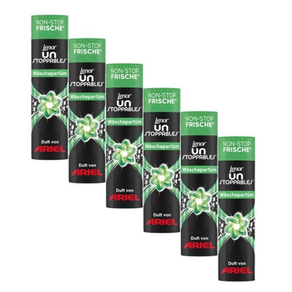 ​6x Lenor Unstoppables Duft von Ariel 300gNon -Stop Frische für die Wäsche (bis zu 12 Wochen im Schrank)Zu jeder Wäsche hinzugeben, für den non-stop FrischekickJe nach gewünschtem Dufterlebnis viel oder wenig dosierenFür alle Textilien geeignet, sogar Wolle, Seide und SportkleidungLenor Unstoppables Wäscheparfüm ist in einer feuchtigkeitsbeständigen, vollständig recycelbaren Kartonverpackung erhältlichLenor Unstoppables Wäscheparfüm ist in verschiedenen Duftvarianten und Größen erhältlichGemeinsam mit Ariel verwenden für strahlende Reinheit und lang anhaltende FrischeEntdecken Sie Lenor Unstoppables Wäscheparfüm für den non-stop Frischekick auf der Wäsche. Lenor Unstoppables verleiht Ihrer Kleidung im Schrank bis zu 12 Wochen lang einen frischen Duft. Der Duft von Ariel überzeugt mit einem sauberen, frischen Duft passend zum Ariel Waschmittel. Einfach bei jeder Wäschein die Trommel geben und nach gewünschter Duftintensität dosieren. Das Lenor Unstoppables Wäscheparfüm ist in einer feuchtigkeitsbeständigen Kartonverpackung erhältlich, die nach Gebrauch im Altpapier recycelt werden kann.IngredientsDuftstoffe, Alpha-Isomethyl Ionone, Benzyl Salicylate, Citronellol, Coumarin, Eugenol, Hexyl Cinnamal, Hydroxycitronellal, Limonene, Linalool.