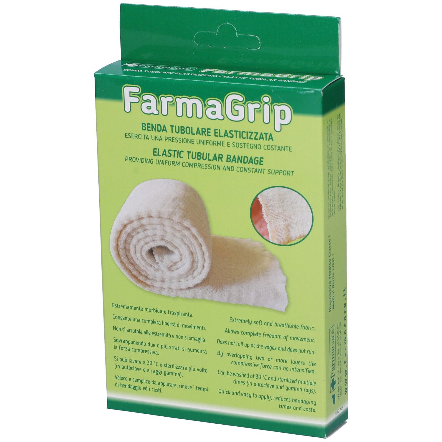 Dispositivo medico di classe I. Benda tubolare elasticizzata. Esercita una pressione uniforme e sostegno costante. Estremamente morbido, non irrita la pelle. FarmaGrip è un tessuto tubolare elastico che permette una fasciatura a compressio controllata, graduale, duratura, su molte parti del corpo. FarmaGrip consente una completa libertà di movimenti. FarmaGrip non si arrotola alle estremità e non si smaglia. FarmaGrip consente, tramite la sovrapposizione di due o più strati, di intensificare la forza di compressione. FarmaGrip si può lavare a 30 °C e sterilizzare più volte. FarmaGrip veloce e semplice da applicare, riduce i tempi di bendaggio ed i costi. Sterilizzabile in autoclave, ossido di etilene e raggi gamma.