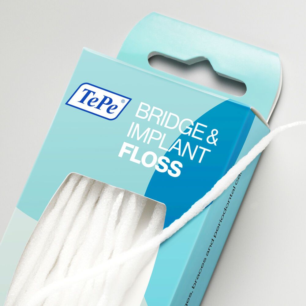 TePe Filo per Ponti ed Impianti è un filo interdentale spugnoso e flessibile appositamente progettato per la pulizia di impianti, ponti ed apparecchi ortodontici. È adatto anche per la cura parodontale. Il filo interdentale è dotato di estremità rigide in plastica per un facile inserimento.