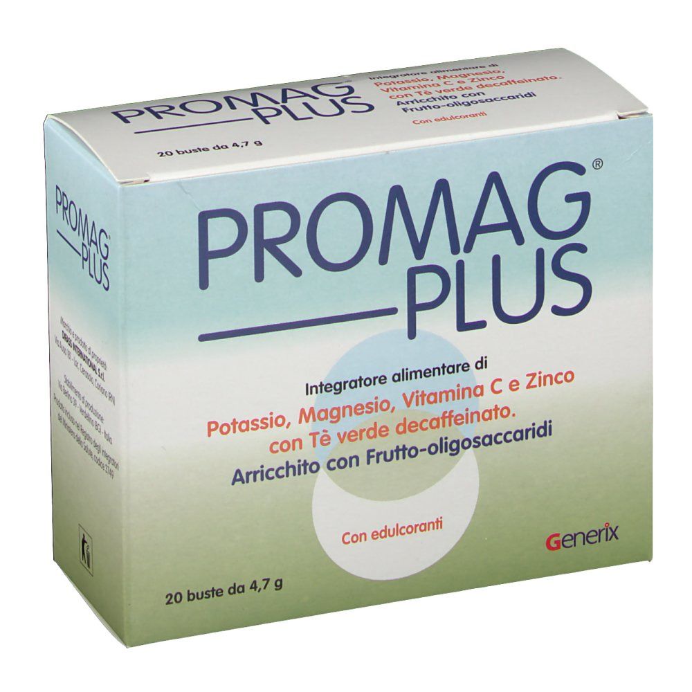 Promag Plus® è un integratore alimentare di Potassio, Magnesio, Vitamina C e Zinco con estratto di Tè verde decaffeinato e Frutto-oligosaccaridi. Il Potassio ed il Magnesio contribuiscono alla normale funzione muscolare, il Magnesio, la Vitamina C ed il Tè verde favoriscono la riduzione della stanchezza e dell'affaticamento.