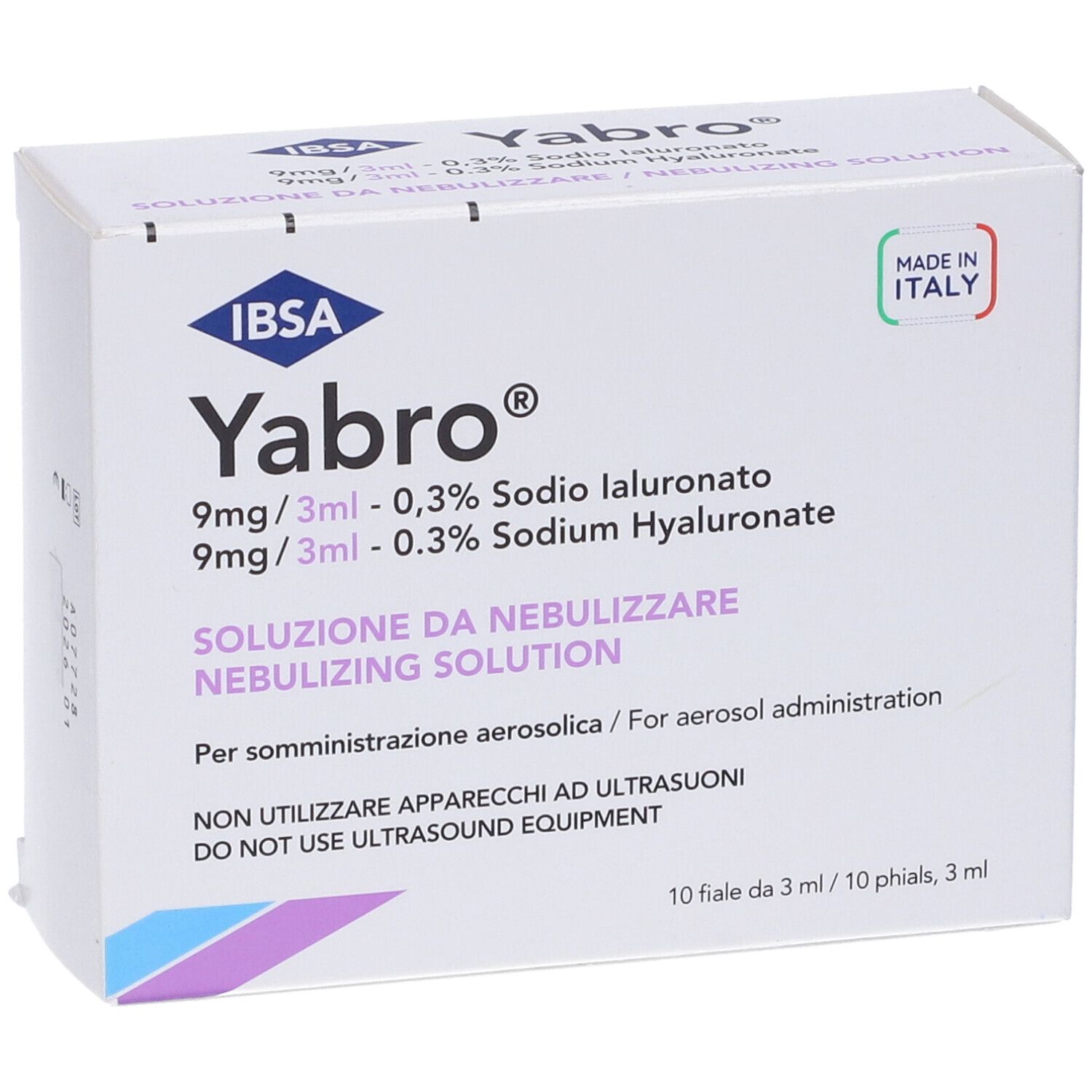 La proposta di IBSA volta all'utilizzo di acido ialuronico per via aerosolica all'interno delle cavità nasali è rappresentata da Yabro, un dispositivo medico contenente una soluzione sterile isotonica di sale di acido ialuronico allo 0,3%.