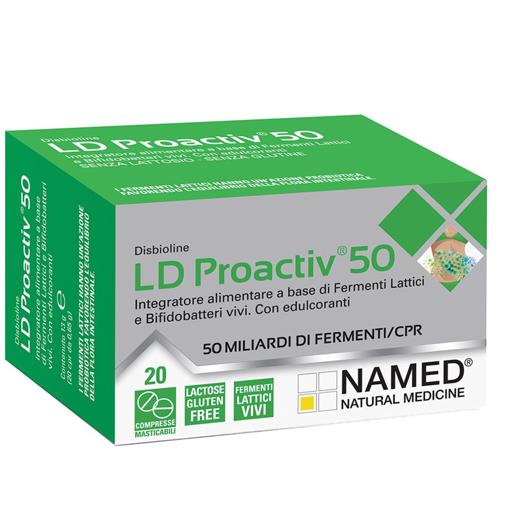 LD Proactiv 50 è un integratore alimentare, ad azione probiotica a base di fermenti lattici e bifidobatteri, utile al mantenimento del benessere intestinale in quanto contribuisce all'equilibrio della flora batterica intestinale che può risultare alterata da stress, antibioticoterapie, diarrea, fattori organici o alimentari.
