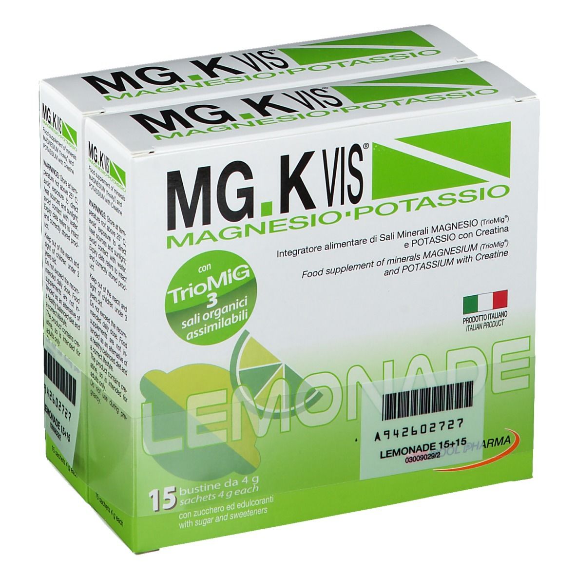 MG.K Vis Bustine è un integratore a base di 3 sali organici assimilabili di Magnesio (TrioMig®: Sali di Magnesio dell’acido citrico, Magnesio gluconato, Magnesio lattato) e Potassio con Creatina. Il Magnesio contribuisce alla riduzione della stanchezza e dell’affaticamento, all’equilibrio elettrolitico, al normale metabolismo energetico. In sinergia con il Potassio, contribuisce alla normale funzione muscolare e al funzionamento del sistema nervoso.