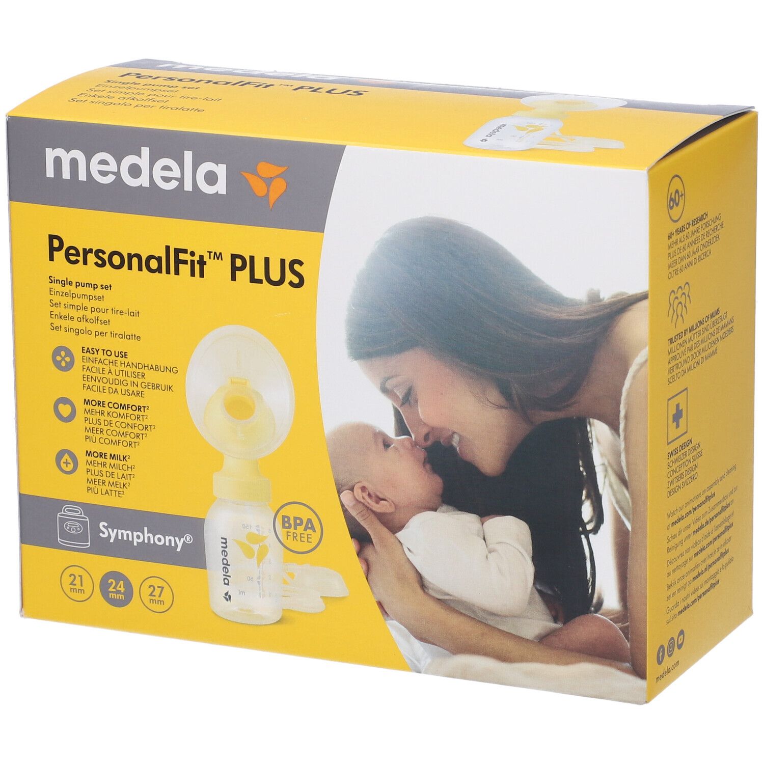 Il set singolo Symphony PersonalFit Plus per tiralatte è indicato per l'utilizzo con il tiralatte Medela Symphony. In ogni set è incluso una bottiglia per la raccolta del latte materno da 150 ml. Il set singolo include due coppe per il seno PersonalFit Plus di taglia M (24 mm).