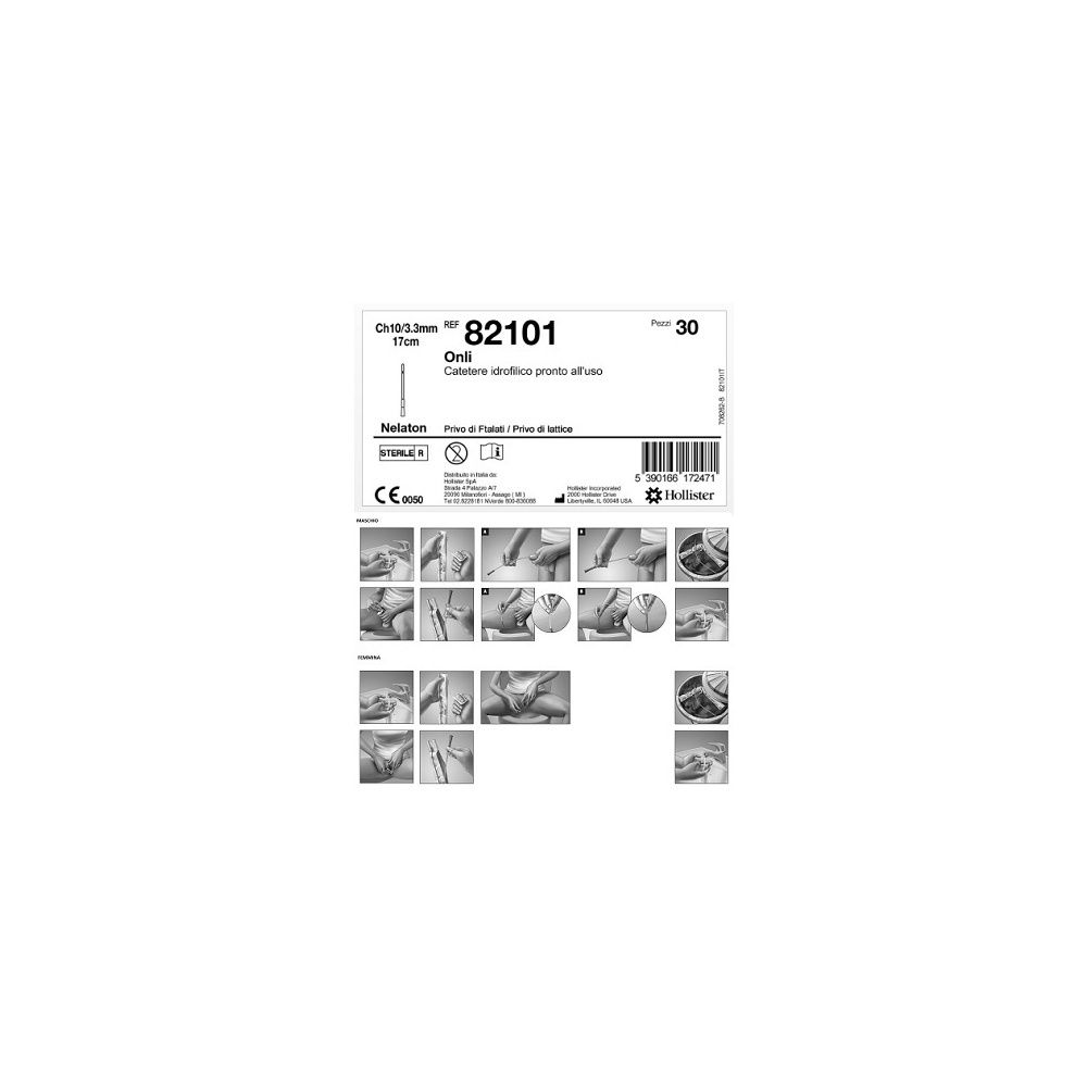 Onli è un catetere monouso, pronto all’uso per cateterismo intermittente. È dotato di un rivestimento idrofilico che ne garantisce la perfetta idratazione durante l’inserimento. Il catetere è privo di ftalati e non continente lattice. Gli occhielli del catetere sono lisci e atraumatici per garantire il massimo comfort durante la manovra. Le dimensioni dei cateteri si distinguono grazie al connettore universale con codice colore. Tubo del catetere Connettore universale Adesivo Idratante per la superficie Confezione primaria Film permeabile Superficie Tri (2-ethylhexyl) trimellitate (TEHTM) polyvinyl chloride TEHTM con colorante Cyclohexanone Acqua Poliestere Polietilene microporoso Idrofilica (PVP) Il catetere intermittente Onli è un dispositivo flessibile tubolare che viene inserito attraverso l'uretra da pazienti uomini, donne e pediatrici che hanno bisogno di drenare l'urina dalla vescica. Non sono presenti controindicazioni all’utilizzo di questo dispositivo. Il tempo necessario per lo svuotamento vescicale. Sterilizzazione con irradiazione. Privo di lattice. Privo di ftalati. Il prodotto ha validità 2 (due) anni dalla data di produzione, la scadenza è indicata sulla confezione. Confezionamento primario: il catetere e confezionato in busta singola sterile. Confezionamento di vendita: scatola di cartone laminato da 30 pezzi con istruzioni per l'uso in italiano. Imballaggio: scatola in cartone corrugato contenente 10 scatole di prodotto.
