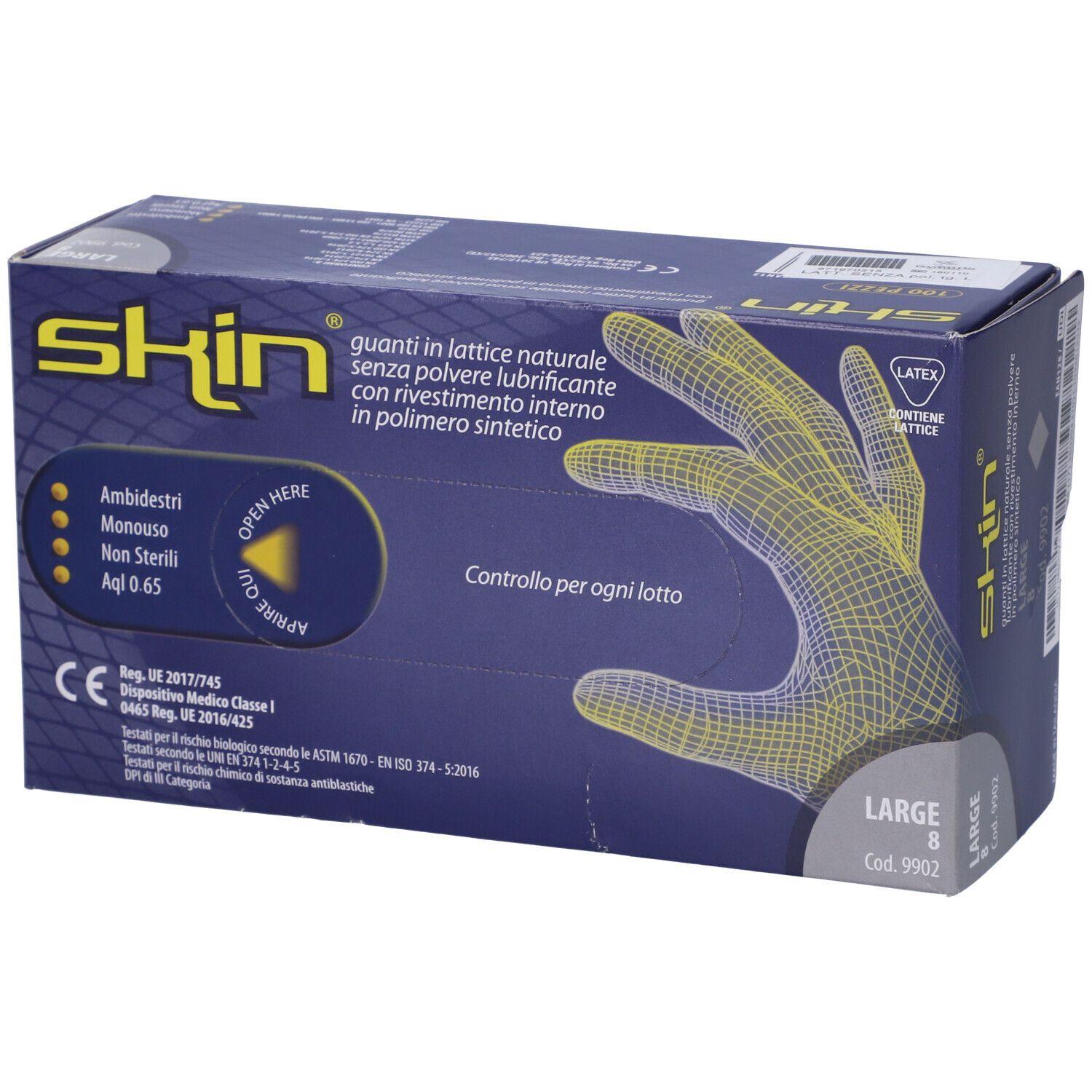 Guanto in lattice senza polvere. Conformi alle norme UNI EN 374 1-2-3 – UNI EN 420 – UNI EN 388 UNI EN 455 1-2-3-4 ASTM 1670-1671, ispezionati secondo le ISO 2859. Prodotti in stabilimenti secondo le ISO 9001E ISO 13485. AQL non superiore a 0,65 certificato da un ente notificato.