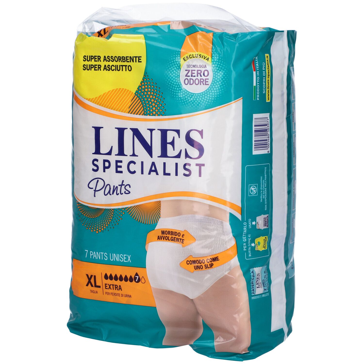I pants Lines Specialist Unisex Extra offrono super comfort e minimo ingombro: hanno un design discreto ed il minimo ingombro nella zona inguinale, permettendo al prodotto di conformarsi meglio al corpo, per una elevata sensazione di comfort. Queste mutandine assorbenti, garantiscono un asciutto lampo grazie alla struttura a strati, studiata per mantenere la pelle asciutta e sana e per offrirti un'assorbenza veloce dei liquidi, che rimangono lontani dalla pelle. Grazie al sistema Zero Odore*, l'odore viene intercettato, bloccato e neutralizzato per una discrezione incredibile! Le barriere laterali, morbide e delicate a contatto con la pelle, aiutano a prevenire le fuoriuscite. I pants Lines Specialist Unisex, ipoallergenici e con ossido di zinco, rispettano l'equilibrio naturale della pelle. *Test su prodotto fresco.