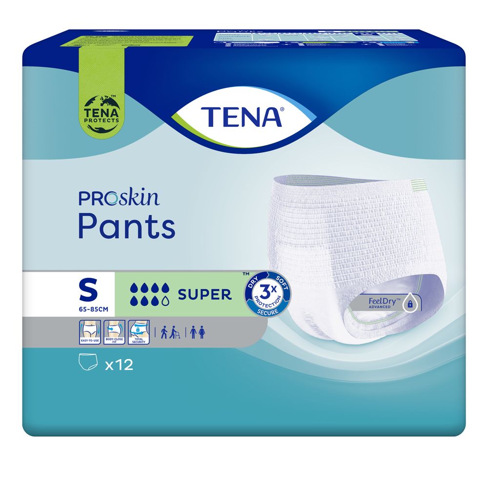 TENA ProSkin Pants Super sono mutandine assorbenti monouso morbide e confortevoli studiate sia per lui che per lei. Sono realizzate con avanzate tecnologie di riduzione dell'umidità per offrire sensazione di asciutto, protezione contro le perdite e controllo degli odori. Per offrire un'elevata protezione, la tecnologia FeelDry Advanced™ allontana rapidamente i liquidi dalla superficie, mentre il nucleo ad assorbimento rapido isola all'istante l'urina, anche in grandi quantità, per offrire una sensazione di asciutto preservando il benessere della cute. Realizzate con materiali traspiranti simili al tessuto, queste mutandine assorbenti monouso offrono la stessa vestibilità della normale biancheria intima, favorendo uno stile di vita attivo e indipendente. Le mutandine TENA ProSkin Pants sono disponibili in diverse taglie e livelli di assorbenza.