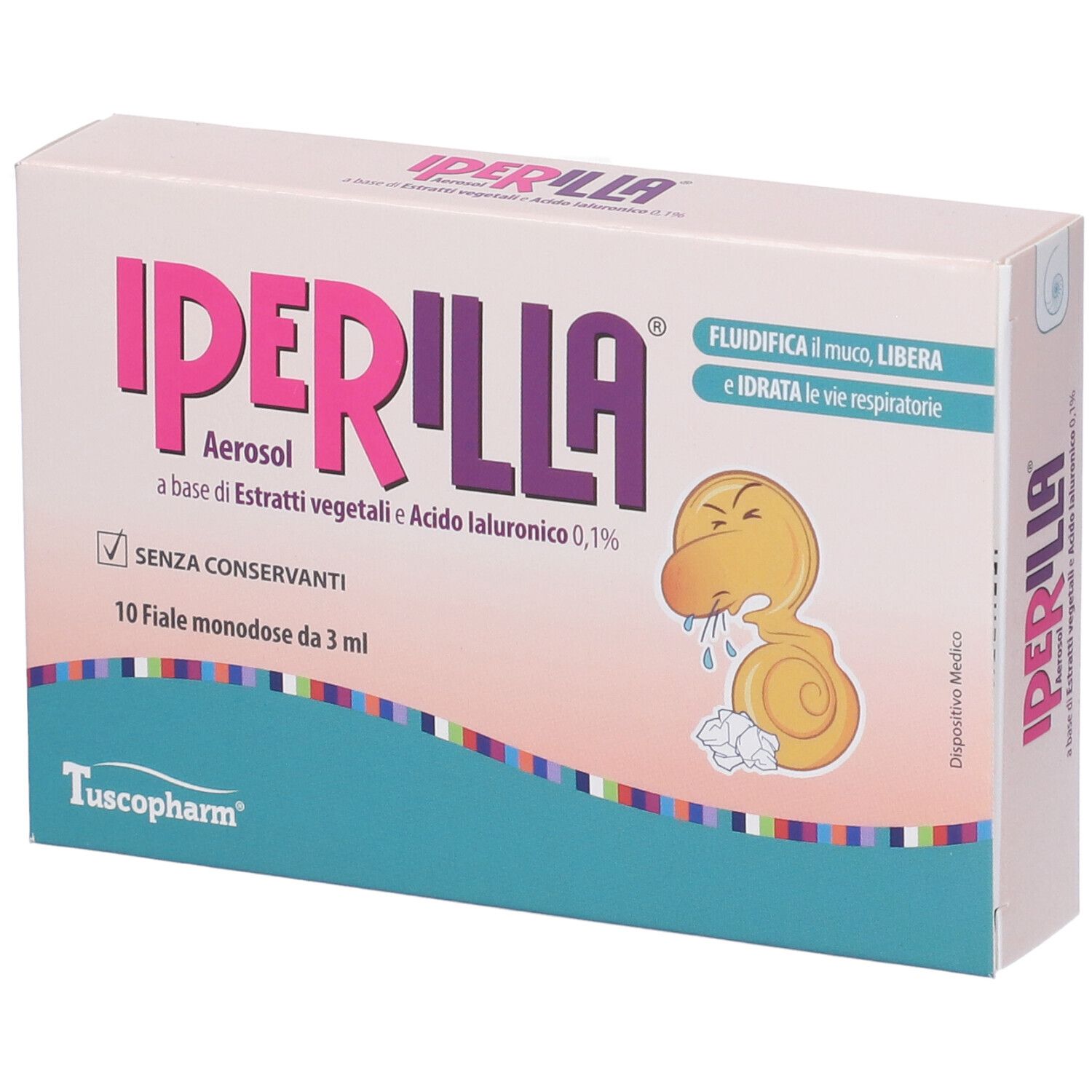 Iperilla aerosol è un dispositivo medico ad uso inalatorio costituito da una soluzione ipertonica a base di estratti secchi vegetali di Melissa officinalis, Perilla frutescens e Timo serpillo in combinazione con acido ialuronico.