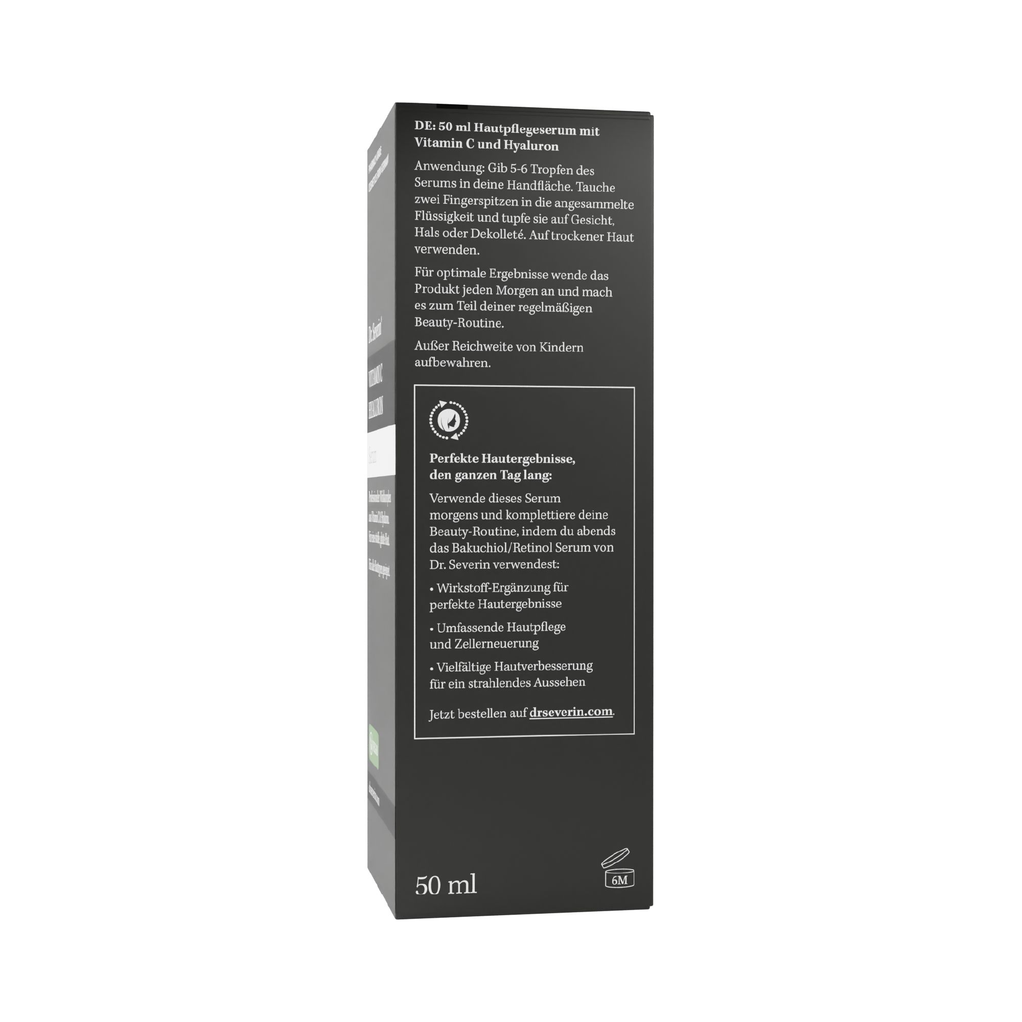 Dott. Severin® Siero all'acido ialuronico alla vitamina C 50 ml Descrizione Il siero ialuronico alla vitamina C del Dr. Severin® è il prodotto ideale per una spinta antietà immediata: una combinazione dosata in modo ottimale di acido ialuronico a basso e alto peso molecolare garantisce un doppio effetto: agisce sia direttamente contro le rughe nello strato superiore della pelle, sia a lungo termine penetrando gli strati più profondi della pelle.