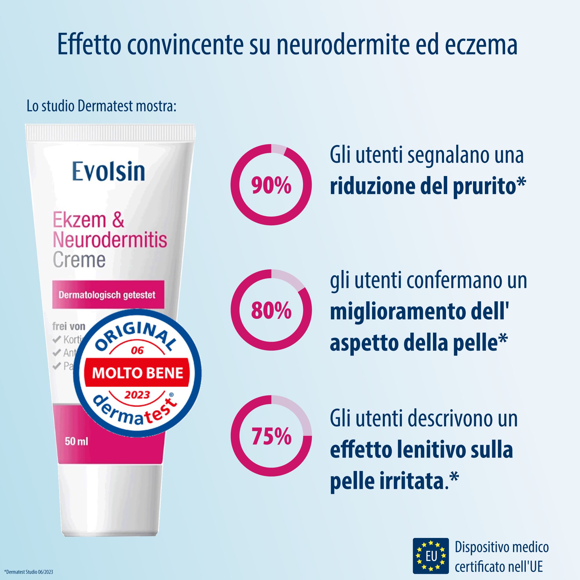 EFFICACIA CONFERMATA: Dermatest conferma l'efficacia della crema in test dermatologici nel trattamento dell'eczema atopico. La pomata riduce il prurito e lenisce la pelle irritata