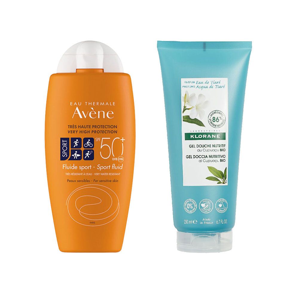 Eau Thermale Avène Fluido Sport protezione molto alta SPF50+ Klorane Gel Doccia Nutritivo al Cupuaçu BIO