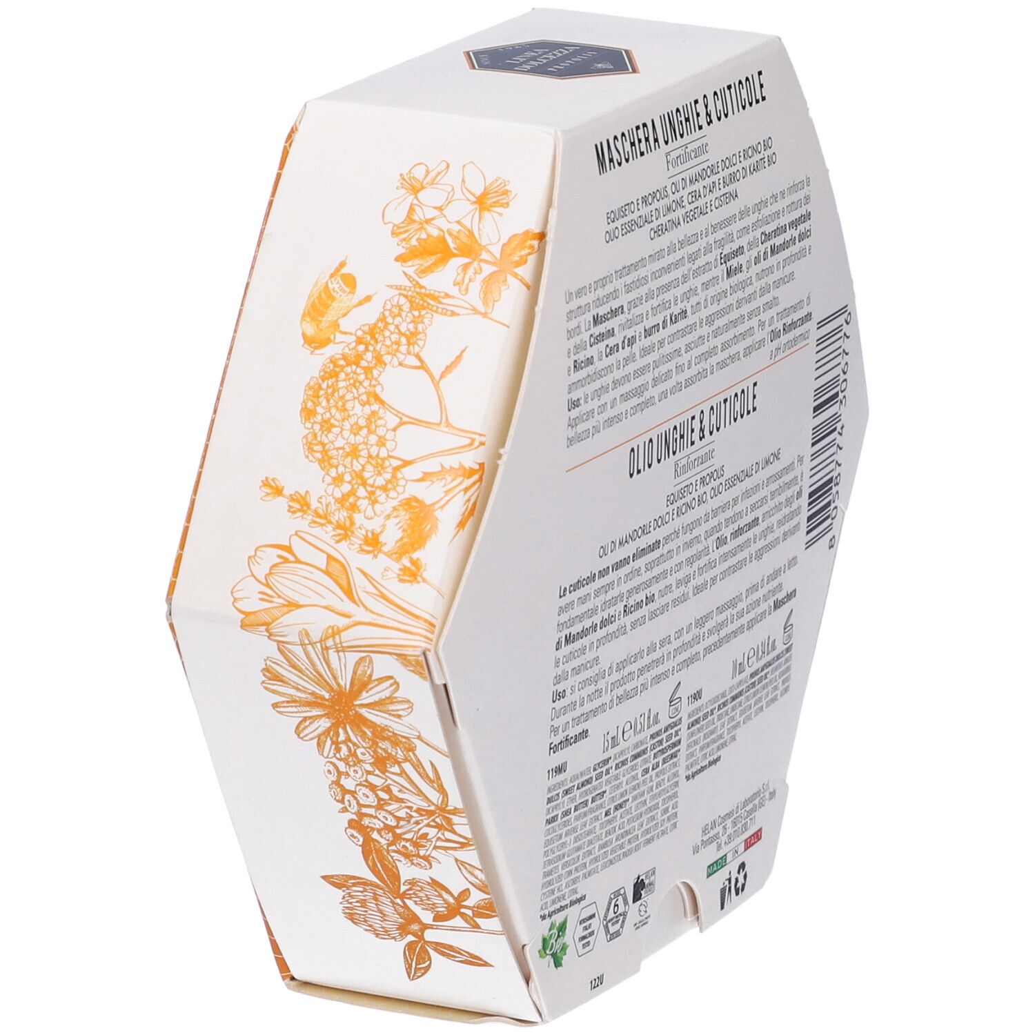 La Maschera, grazie alla presenza dell'estratto di equiseto, della cheratina vegetale e della cisteina, rivitalizza e fortifica le unghie, mentre gli olii di mandorle dolci e ricino, la cera d'api e burro di karitè, tutti di origine biologica, nutrono in profondità e ammorbidiscono la pelle.