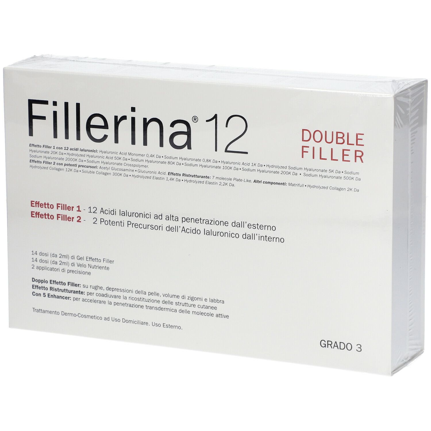 I Trattamenti dermo-cosmetici ad uso domiciliare Fillerina 12 Double Filler offrono 3 concentrazioni con mix diversificati di 12 molecole di Acidi Ialuronici, delle molecole dei 2 precursori Acido Glucuronico e Acetil Glucosammina e delle 7 molecole Plate-Like da scegliere in base alle condizioni della pelle e delle rughe o solchi.