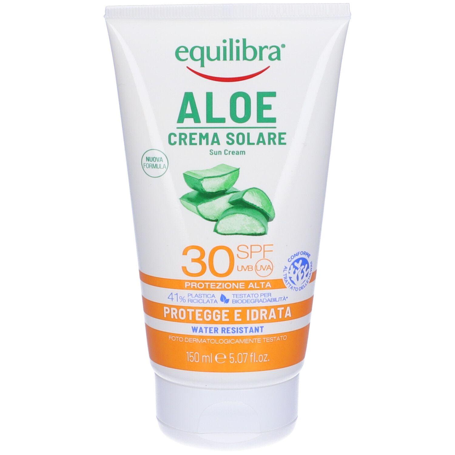 Aloe Crema Solare SPF 30 Equilibra® protegge la pelle dalle scottature e assicura un’abbronzatura sana e naturale. La Vitamina C e la Vitamina E stimolano le naturali difese della pelle. L'Olio di Argan, l'Olio di Cocco e il Burro di Karité, contenuti in formula, contribuiscono a nutrire ed idratare la pelle, contrastando i processi di invecchiamento. Conforme al trattato delle Hawaii: Senza Benzophenone-3 (Oxybenzone) e senza Ethylhexyl Methoxycinnamate (Octinoxate) ritenuti dannosi per la barriera corallina