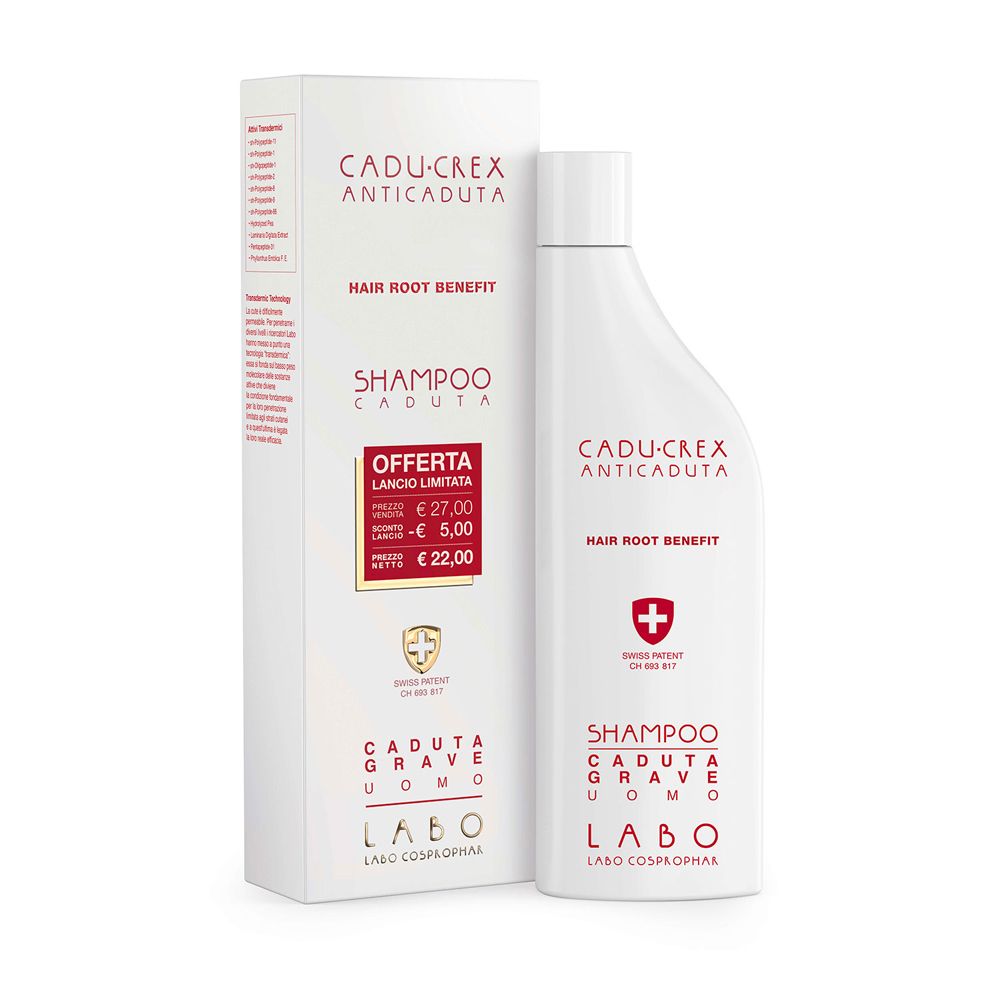Shampoo specifico coadiuvante contro la caduta dei capelli. Si avvale dell’attività del complesso anticaduta brevettato di Labo (Brevetto Svizzero ed Europeo) composto da Idrossiprolina, Acido Aspartico, Attivatore Enzimatico e di Taurina, utili a rinforzare la radice dei capelli contrastandone il distacco. Contiene inoltre i complessi PLC7, Pilum-Stem, il complesso Isole Follicolari Caduta, Scalp Microbiome Complex e il nuovo attivo Hair Root Benefit (Ocimum Basilicum Hairy Root Culture Extract). La presenza di 5 Enhancer favorisce la funzionalità degli attivi specifici. Caratterizzato da una specifica base lavante, è il complemento ideale dei trattamenti anticaduta Cadu-Crex in fiale. Formula specifica per uomo.