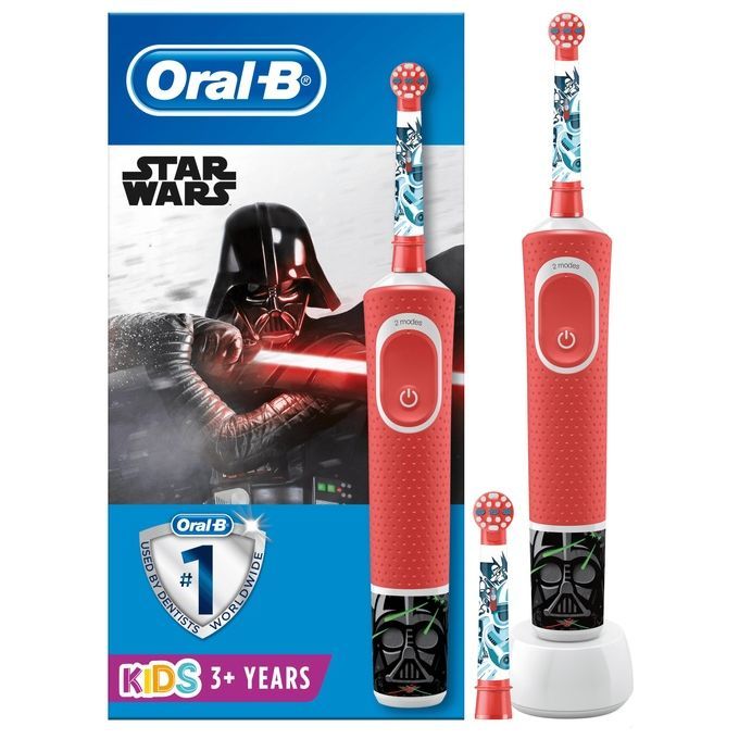 Spazzolino Elettrico Ricaricabile Oral-B Kids per bambini dai 3 anni in su. Offre la pulizia efficace e delicata di uno spazzolino Oral-B e il divertimento di Star Wars. Con l'esclusiva modalità delicata studiata per i bambini, questo spazzolino pulisce delicatamente denti e gengive dei più piccoli. Rimuove fino al 100% in più di placca rispetto ad uno spazzolino manuale tradizionale. Sono inclusi 4 adesivi a tema Star Wars per personalizzare lo spazzolino. Il 90% dei bambini spazzola i denti più a lungo con l'App Disney Magic Timer raggiungendo i 2 minuti di spazzolamento, come raccomandato dai dentisti.
