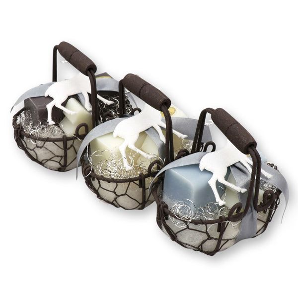 Cestino in filo metallico riempito con sapone al latte di pecora, decorato con cervo in feltro