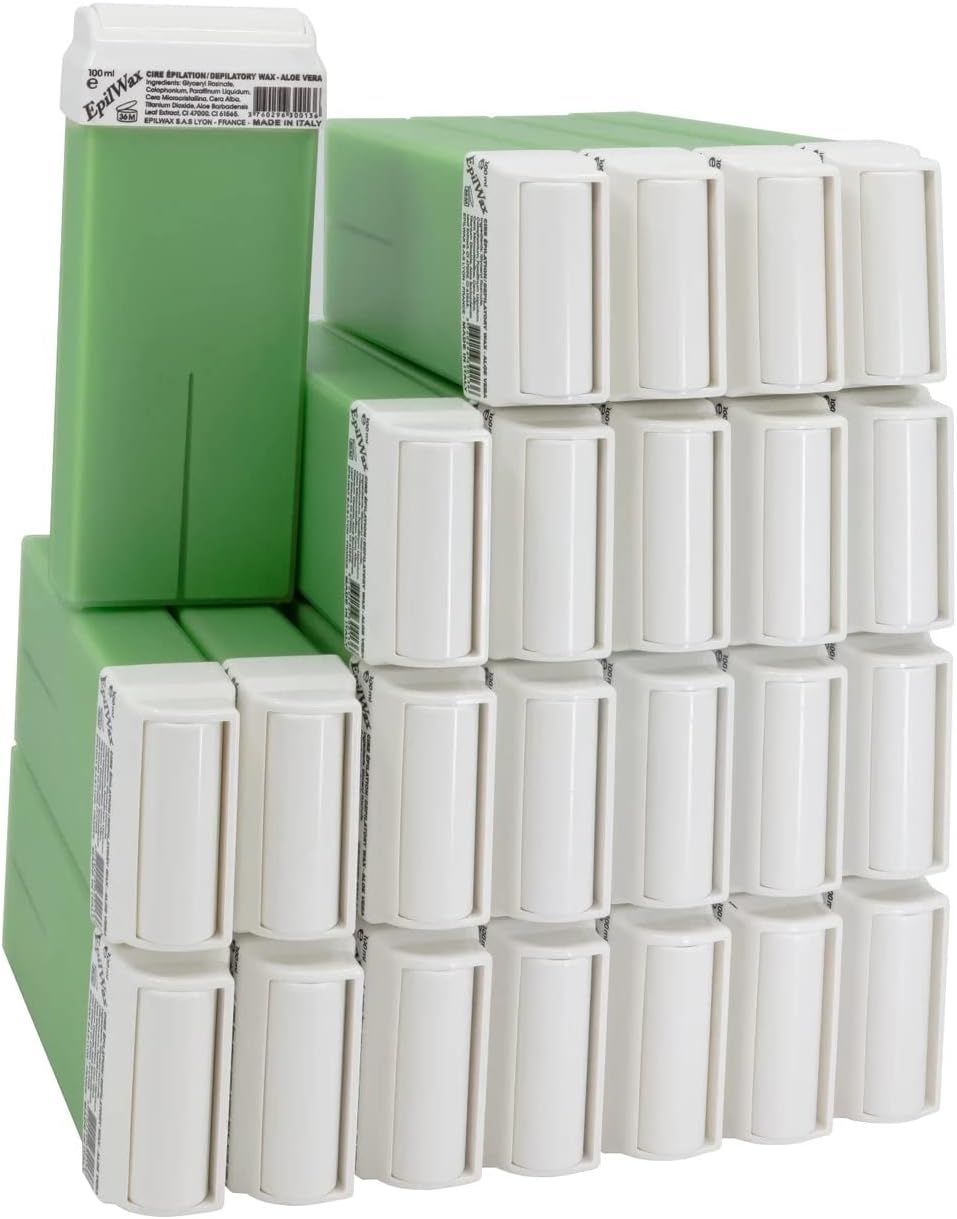 Confezione da 24 cartucce di cera roll-on all'aloe vera. L'aloe vera è nota per i suoi effetti curativi e cosmetici sulla pelle. Adatta a tutti i tipi di pelle, anche a quelle particolarmente sensibili.